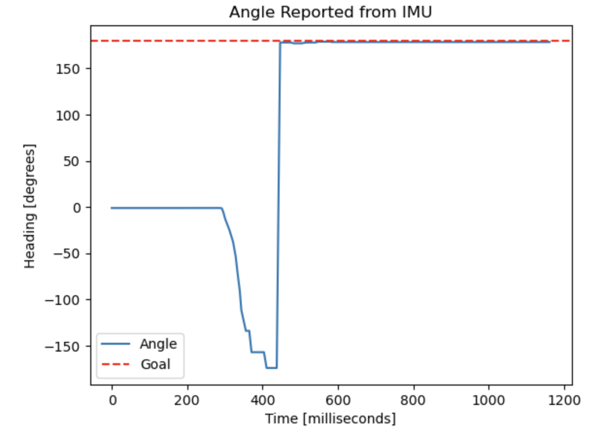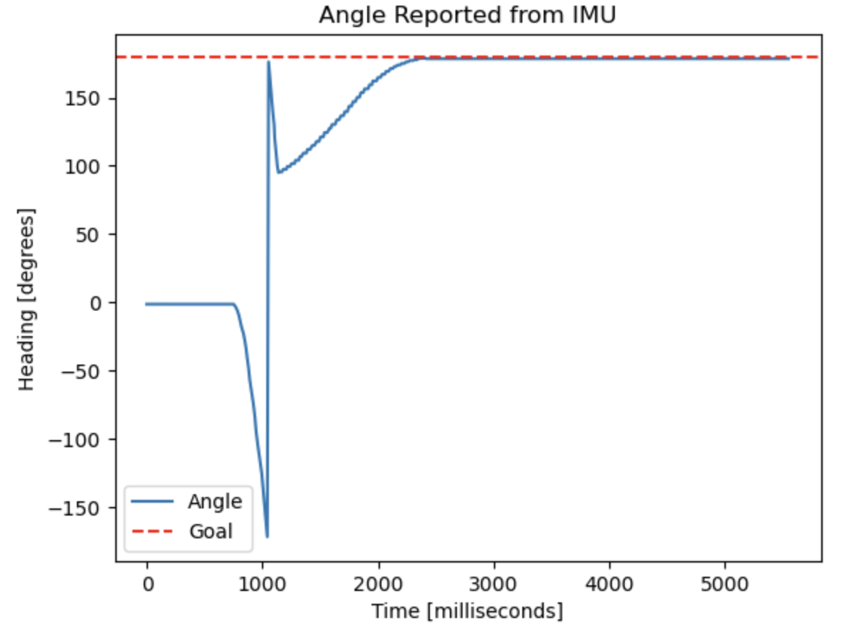 Recognizing that the maximum error I could get between the car’s current heading and the goal heading was 180°, I decided that I should first try a kp value of 1, as this would cause the maximum PWM signal to be 180. While this might seem large when compared to the PWM signals of Lab 5, this signal is being used for a completely different motion. Rotational motion requires more energy, and the deadband is significantly higher. Here, I set the deadband to 160, which is higher than what I found in Lab 3, but this allows for the car to move more smoothly.