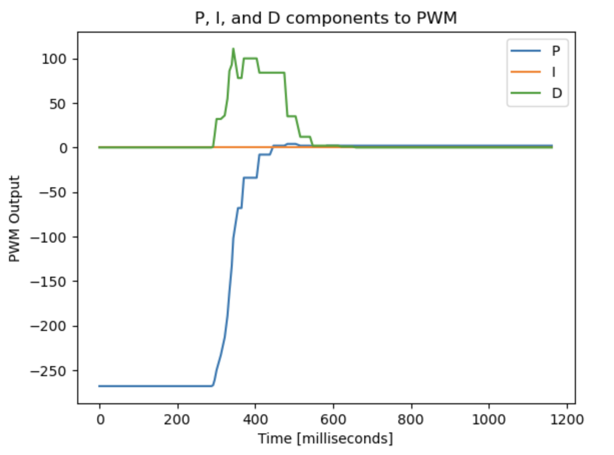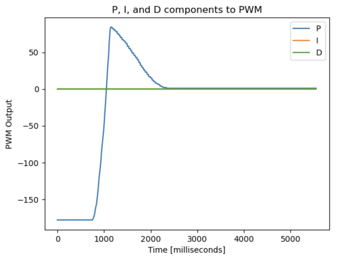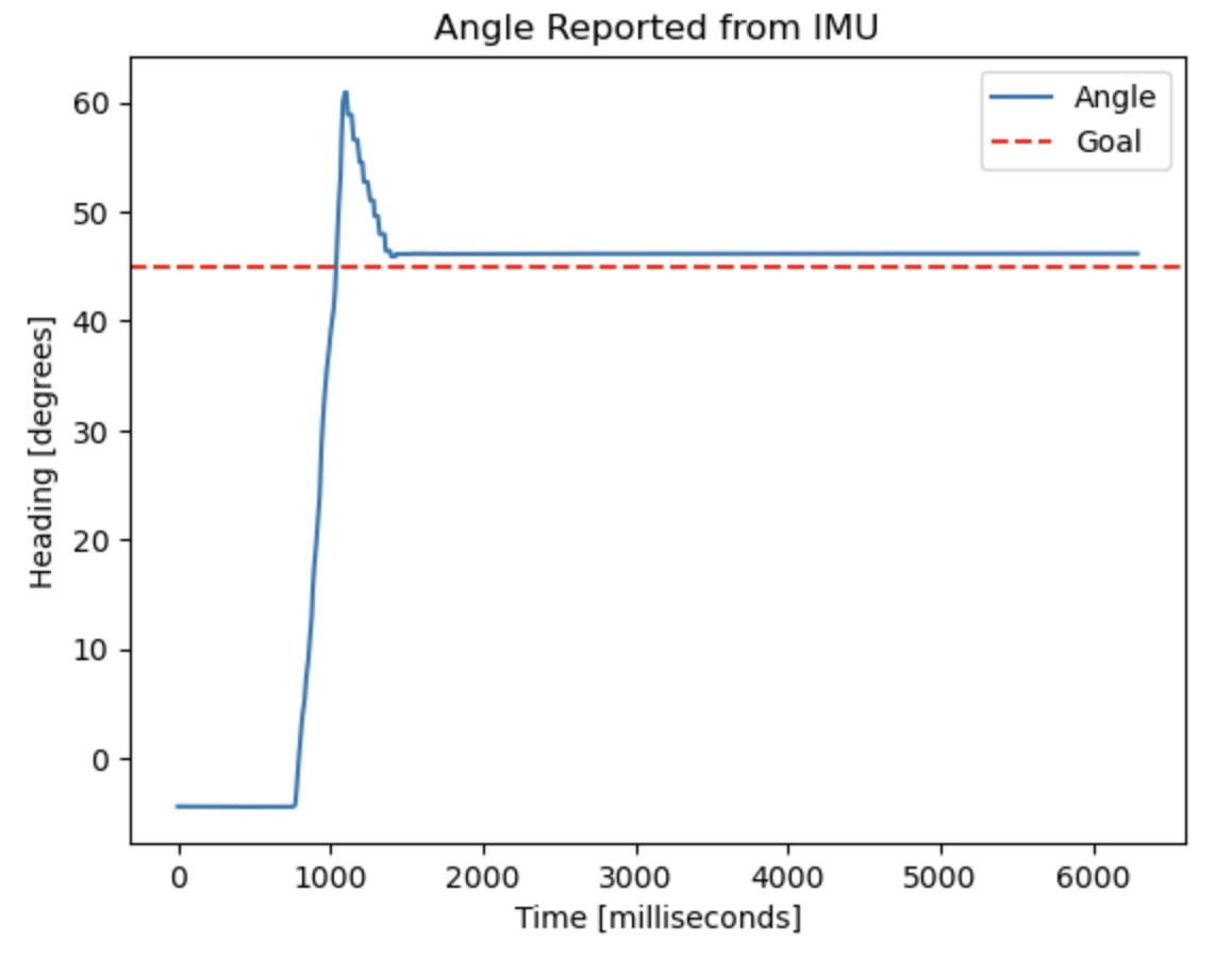 Using kp = 1.0 and kd = ki = 0.0 was a good start, but it resulted in a significant amount of overshoot. The following data was collected when the car was attempting to rotate 45° to the right.