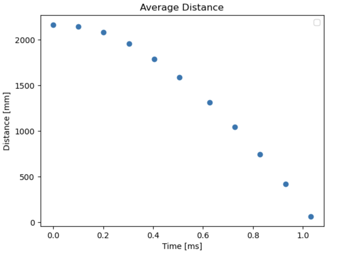I collected data about my car’s distance from a wall while driving towards it with a PWM input of 255. I took the average of four trials and plotted them below: