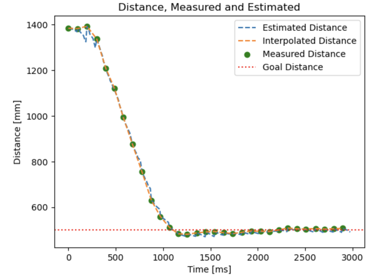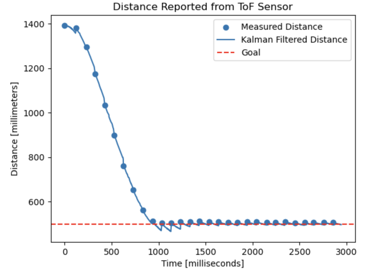 Whenever the controller ran, kf_predict was called to update the prediction and uncertainty of the state. If a new ToF reading was available, then I would also call kf_correct and use that reading to correct the prediction.