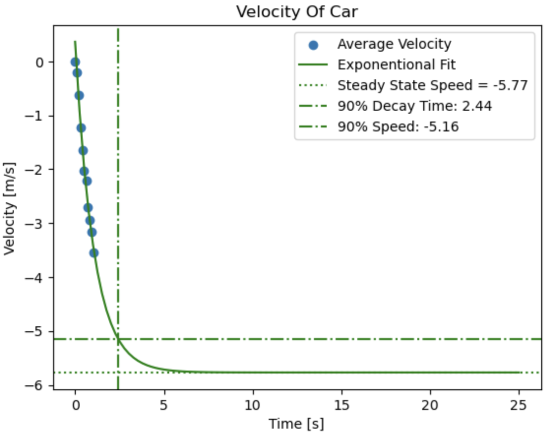Unfortunately, the car wasn’t able to achieve a steady state velocity before hitting the wall, so I had to fit an exponentially decaying curve to the velocity data and approximate what the steady state velocity would be. I decided to leave out the first two velocity data points when fitting this curve because they corresponded to when my car was just starting to move and wasn’t accelerating too much.