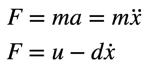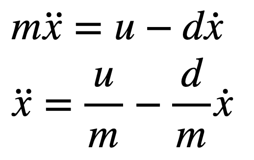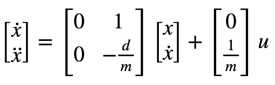 Here, the 2x2 matrix is A, and the 2x1 matrix is B. The only unknowns are d, a drag constant, and m, the inertial mass of the car. Luckily, these can be found by doing a force balance on the car and assuming that the PWM input, u, acts as a force on the car. From here, we can write: