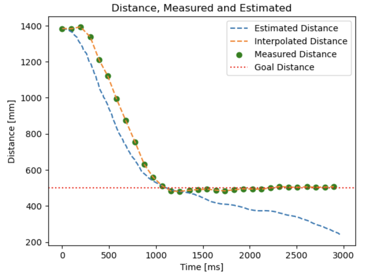 Additionally, a large part of tuning is determining what a good amount of measurement noise and process disturbance to give the filter is. When the measurement uncertainty was very high, the estimated distance didn’t correct itself if measurements were taken. To show this, I took data from Lab 5 and used it to characterize the behavior of the Kalman filter. Below, you can see how the Kalman filter doesn’t respond when the measurement noise is significantly higher than the process noise: